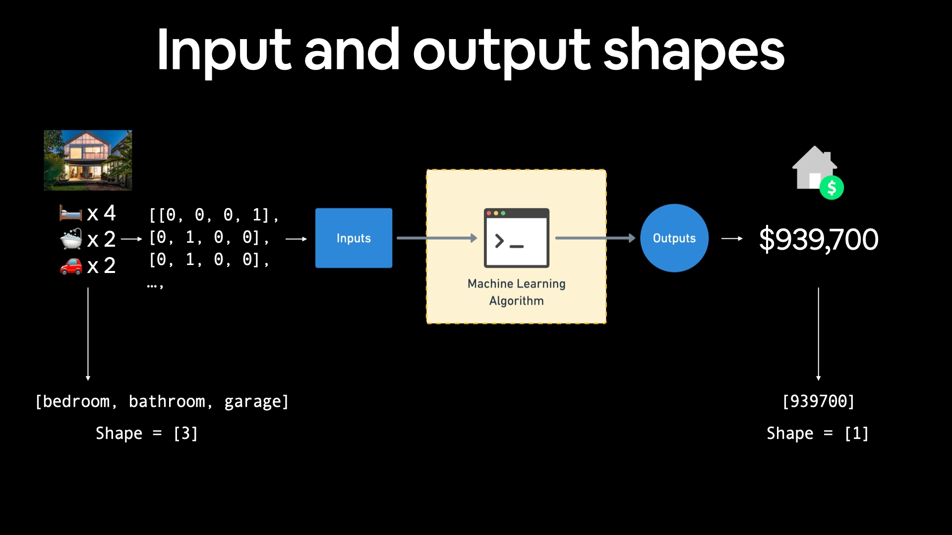 Konut fiyatlarını tahmin etmek için bir makine öğrenimi algoritması oluşturmaya çalışıyorsanız, girdileriniz yatak odası sayısı, banyo sayısı ve garaj sayısı olabilir ve size 3 (3 farklı özellik) girdi şekli verir. Ve evin fiyatını tahmin etmeye çalıştığınız için çıktı şekliniz 1 olur.